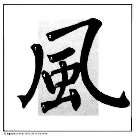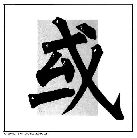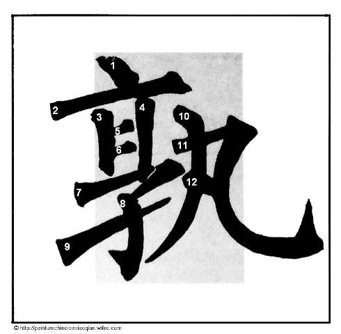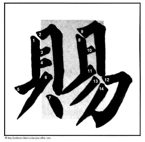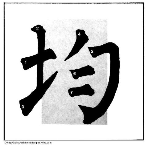 Voici les différents crochets du style Liu. Pour chaque crochet est donné un exemple de caractère chinois. Sur chaque trait de chaque caractère est donné un numéro en fonction de l’ordre d’écriture des traits du caractère. Le numéro est inscrit à l’amorce du trait.