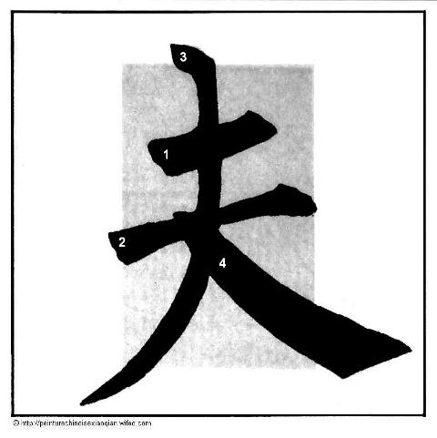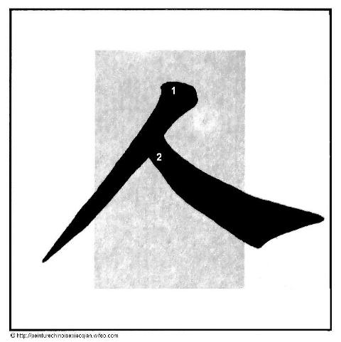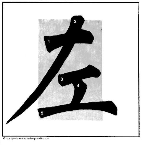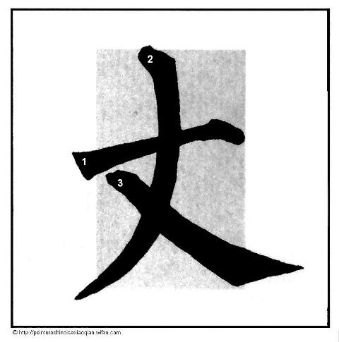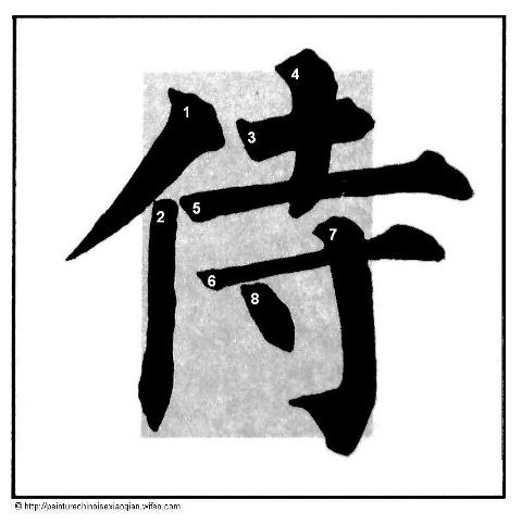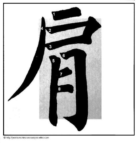 Voici les différents traits jetés du style Liu. Pour chaque trait est donné un exemple de caractère chinois. Sur chaque trait de chaque caractère est donné un numéro en fonction de l’ordre d’écriture des traits du caractère. Le numéro est inscrit à l’amorce du trait.