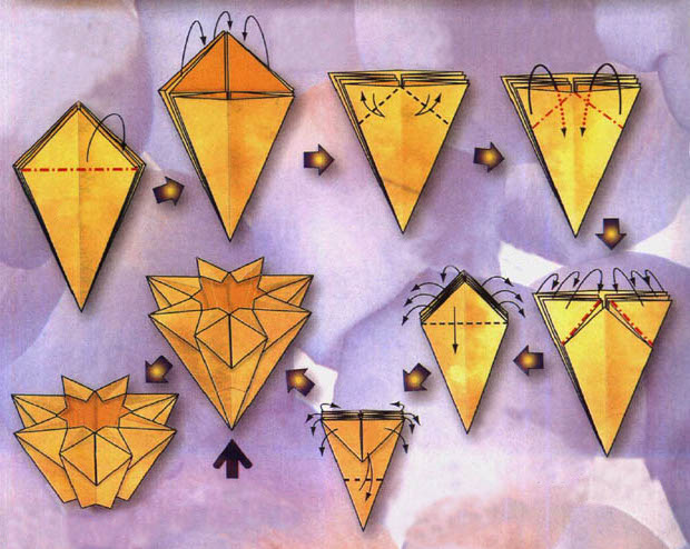 Berikut adalah tahapan yang berbeda untuk mencapai origami mangkuk bunga :