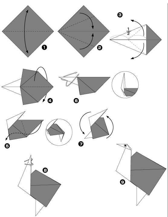 Hier zijn de verschillende stadia van een origami van struisvogel te bereiken :