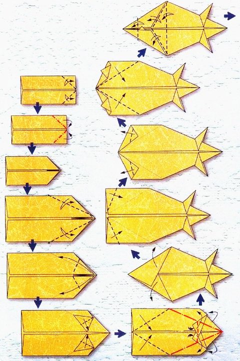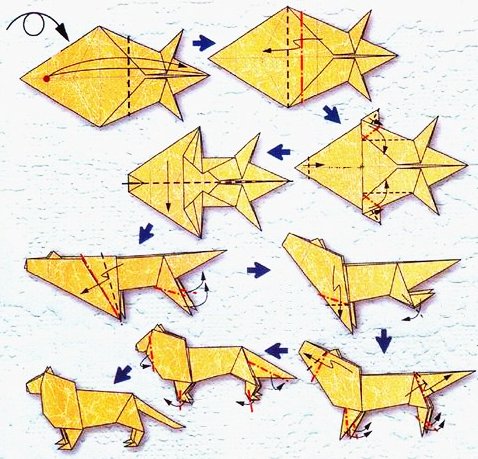 Her er de forskjellige stadier for å oppnå en origami av leo, Modell 3: