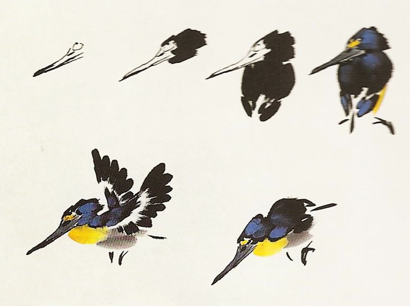 Voici les différentes étapes pour peindre un martin-pêcheur en peinture chinoise xieyi :